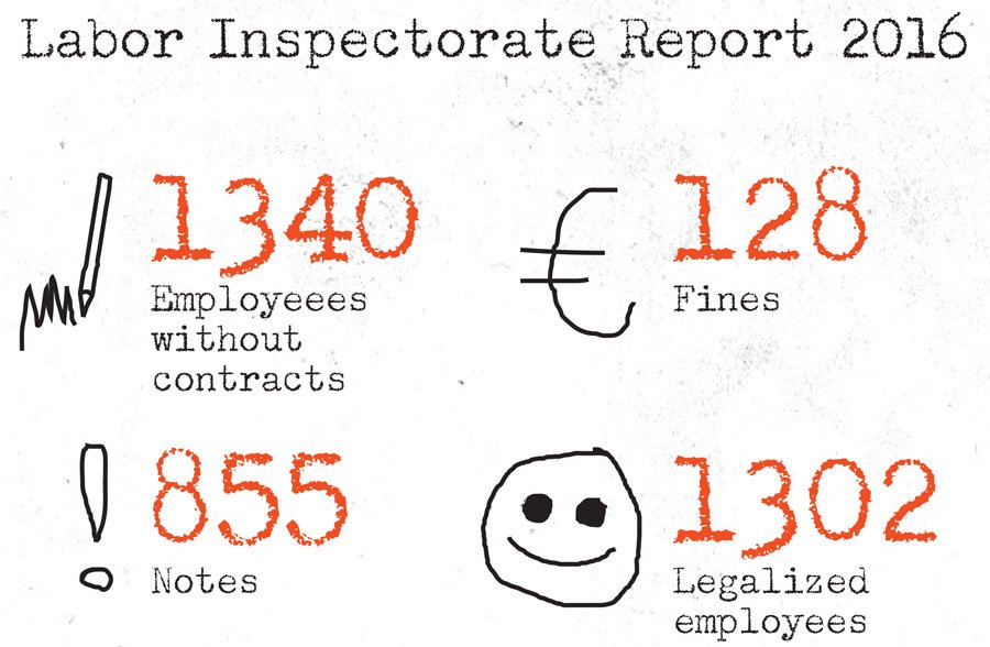 The 2016 inspections carried out by this inspectorate found 1340 employees without contracts. During these inspections, 855 remarks and 128 fines were imposed against employers. These data also indicate that there have been violations of workers' rights, and if there were more inspections in place, more such cases would probably be evidences.