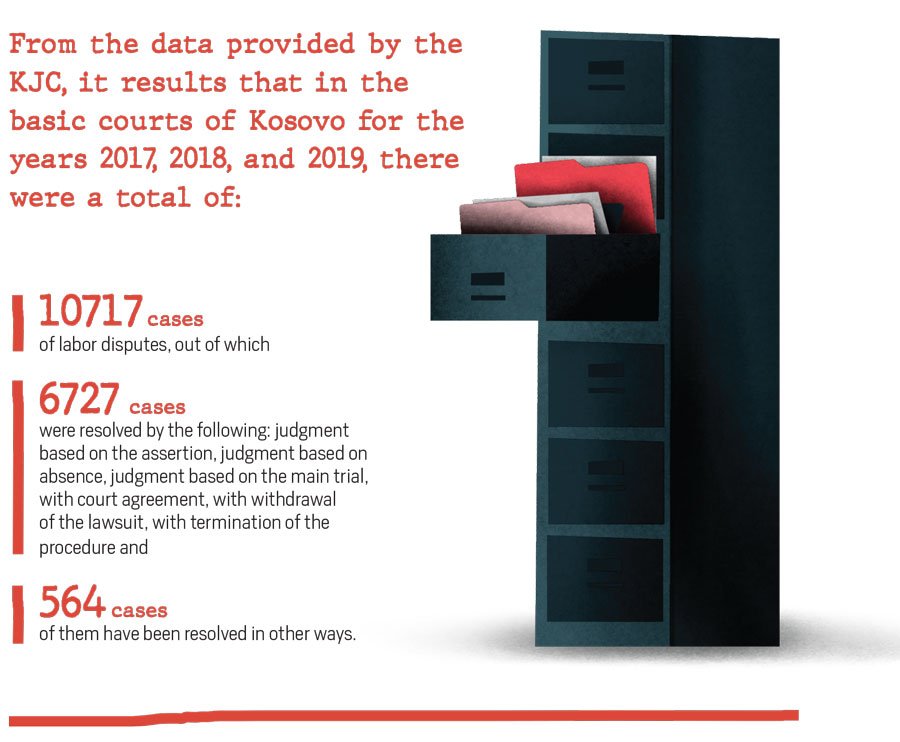 From the data provided by the KJC, it results that in the basic courts of Kosovo for the years 2016, 2017 2018, and 2019, there were a total of 10,717 cases of labor disputes, out of which 6,727 cases were resolved by the following: judgment based on the assertion, judgment based on absence, judgment based on the main trial, with court agreement, with withdrawal of the lawsuit, with termination of the procedure and 564 cases of them have been resolved in other ways. While unresolved labor dispute cases at the end of 2019, in the basic courts of Prishtina, Prizren, Mitrovica, Peja, Gjakova, Gjilan and Ferizaj, are in total 4068.