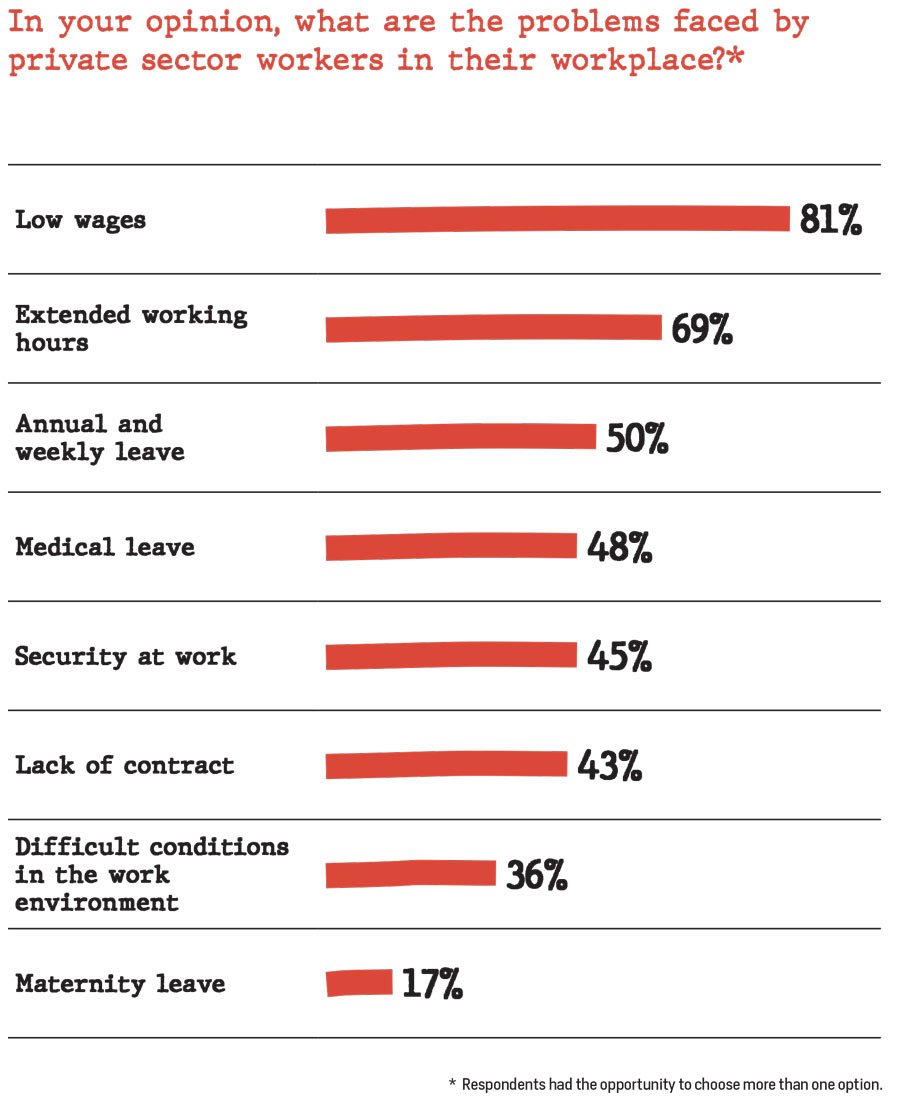 According to the respondents' perception, the three main problems faced by private sector workers are: Low wages, overtime work and lack of weekly and annual leave.