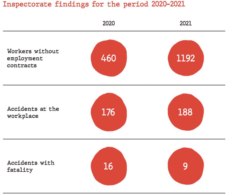 The Labor Inspectorate is an important mechanism that oversees the implementation of the Labor Law, as well as the implementation of the Law on Health and Safety at Work, but also other bylaws that regulate the employment relationship between the employee and the employer. Inspection data for the years 2020 and 2021 show that numerous cases of workers without employment contracts have been identified. These data also show the number of fatal accidents and injuries in the workplace. In terms of injuries, not all injuries are reported to inspectorates. An earlier Preportr investigation showed that there were significantly more workers injured in the construction sector than the data possessed by the inspectorate.