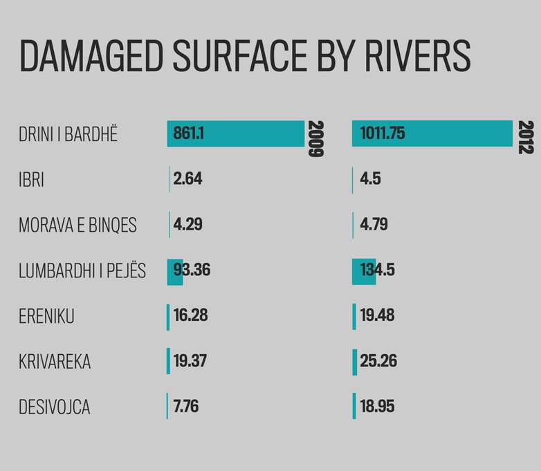 According to these data, the river that suffered the most was Drini i Bardhë, since 861.1 hectares of its area were damaged in 2009, while in 2012 the damaged area of this river reached 1011.75 hectares. After Drini i Bardhë comes Lumbardhi I Pejës. 93.36 hectares of its area were daaged in 2009, while in 2012 the degraded area reached 134.5 hectares.