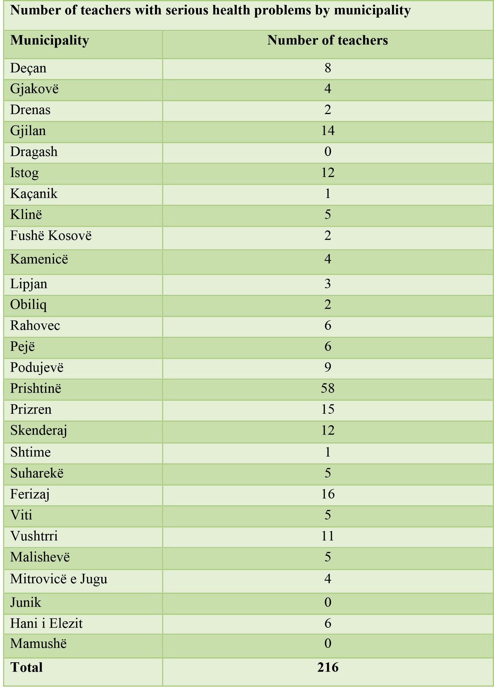 According to the Ministry of Education, Science and Technology, MEST, there are around 23,000 teachers working in Kosovo. However, neither the MEST, the United Syndicate of Education, Science and Culture, SBASHK, nor the Municipal Directorates of Education have ever provided data on the number of teachers living with serious health problems.