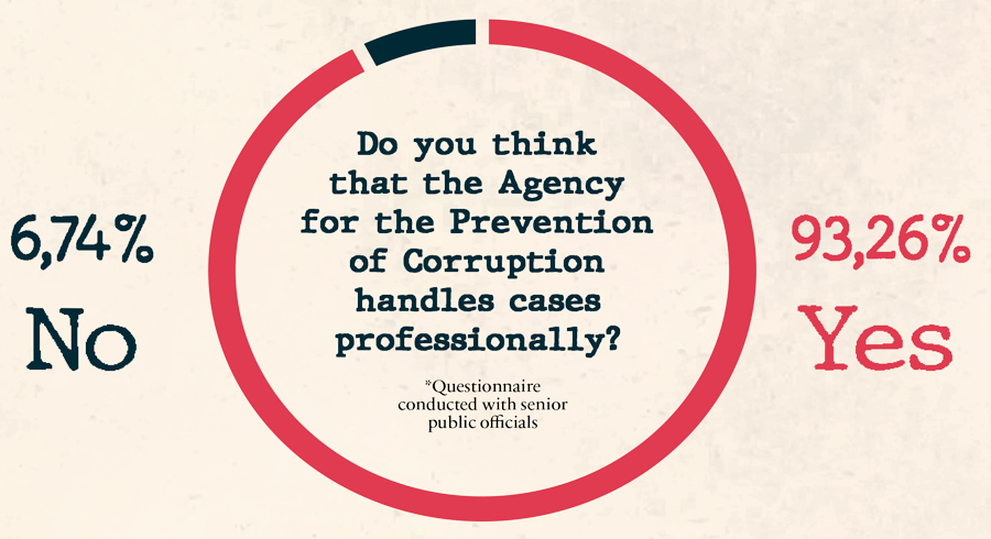 According to the answers received, 70 percent of them think that the cases of conflict of interest are properly handled by the Agency for the Prevention of Corruption.