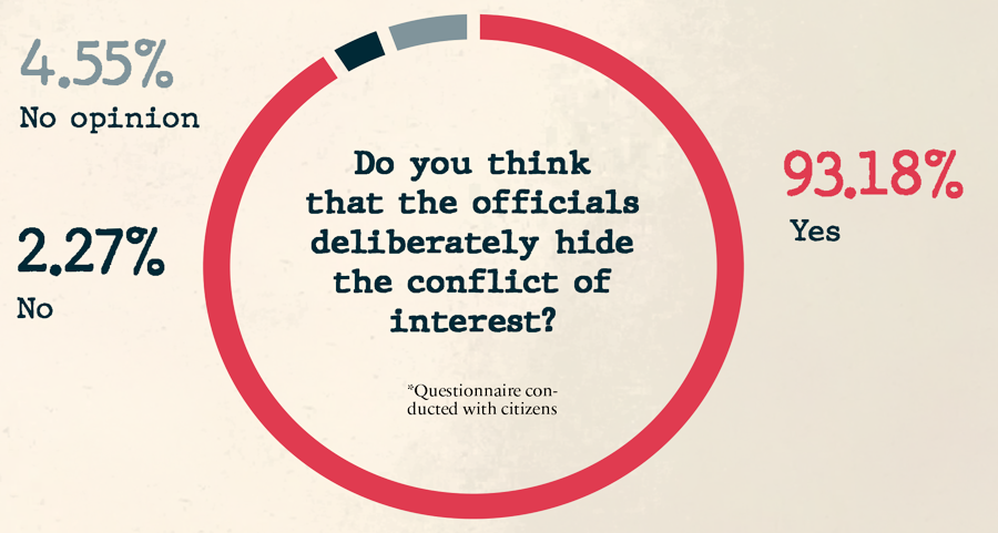 Citizens were also asked about the conflict of interest, where 84 percent of respondents said that cases of conflict of interest are not handled properly, and that officials deliberately hide the conflict of interest.