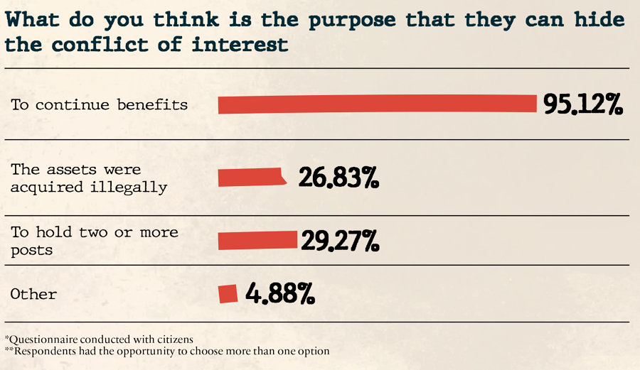 Some of the reasons for which officials hide the conflict of interest, according to citizens, are to continue their benefits, to hold two or more positions, and because of obtaining assets in an illegal way.
