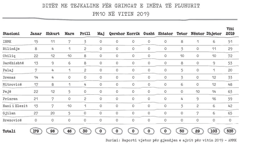 Këto burime ndikojnë që shumë qytete të Kosovës për qindra ditë ta kenë ajrin shumë të ndotur. Sipas raportit vjetor të Agjencisë për Mbrojtjen e Mjedisit të Kosovës (AMMK) për gjendjen e ajrit për vitin 2019, në të gjitha stacionet janë regjistruar 535 ditë me tejkalime (tejkalimet e ditëve kalkulohen në secilin stacion) të ndotjes me PM10 - grimca të imëta të pluhurit. Raporti thekson se janë shqetësuese emetimet ndotëse shkarkuese nga Termocentralet Kosova A dhe B.