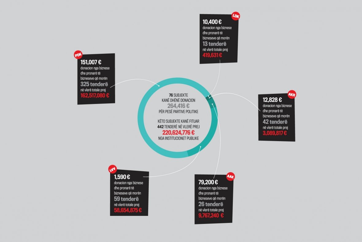 Të dhënat nga hulumtimi i Preportr tregojnë se shtatë kompani që kanë financuar LDK-në kanë fituar 13 tenderë në institucione publike. Vlera e këtyre tenderëve është 419,631 euro.