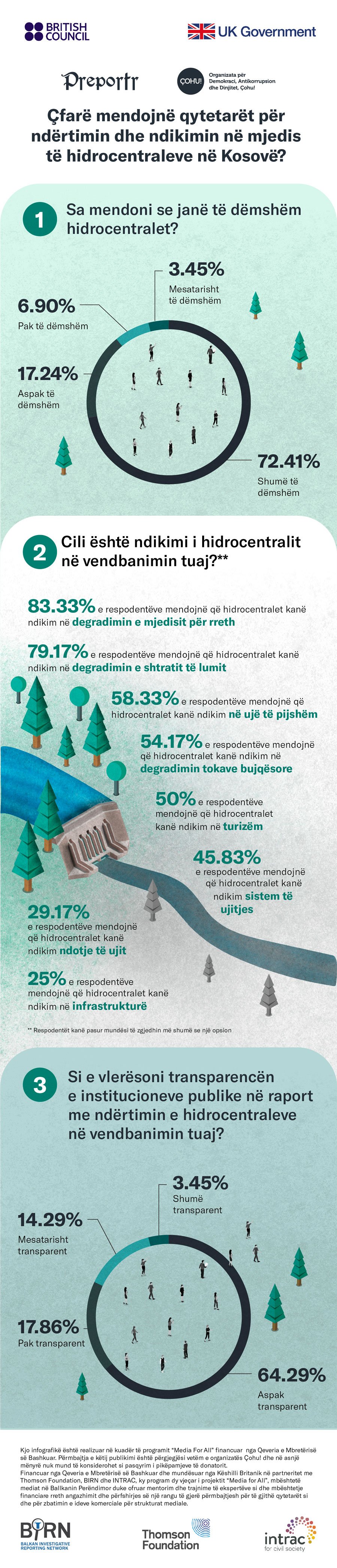 Nga të dhënat e gjeneruara nga pyetësori, rezulton se 72 për qind e respondentëve i konsiderojnë hidrocentralet të dëmshme për mjedisin dhe vendin ku ata jetojnë.