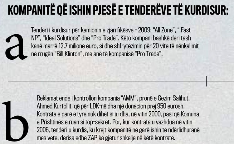 Që nga viti 2007, tenderët e dhënë nga Komuna e Prishtinës, pareshtur favorizuan kompani të cilat ose janë të lidhura politikisht me ndonjërën nga partitë e mëdha në pushtet, ose janë kompani që tanimë veç kanë dështuar në kryerjen e shërbimeve me tenderët e kaluar.