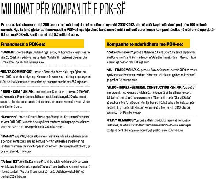 Lista e kompanive që përfitojnë nga buxheti komunal, që asnjëherë nuk është nën 57 milionë euro për vit, është e mbushur me kompani financuese të PDK-së. Kështu, nga shuma e nxjerr nga Preportr, del se financuesit e PDK-së nga kjo vlerë prej 100 milionë, kanë marrë mbi 8 milionë euro, kurse kompani të cilat në një formë apo tjetër janë të lidhura me PDK-në, kanë marrë mbi 5.7 milionë euro.