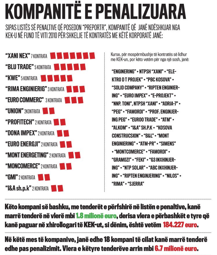 Po ashtu, “Preportr” ka krahasuar listën e penaltive të akorduara nga KEK-u në vitin 2010 dhe listën e 200 përfituesve më të mëdhenj. Nga këto 200 kompani, 25 prej tyre janë penalizuar nga KEK, përderisa 18 prej tyre, me gjithë penalizmin nga KEK-u, kanë vazhduar të përfitojnë tenderë në vlera deri në 1 milion euro. Në mesin e këtyre kompanive të penalizuara është edhe kompania: “I & A sh.p.k”e familjes Zhugolli.