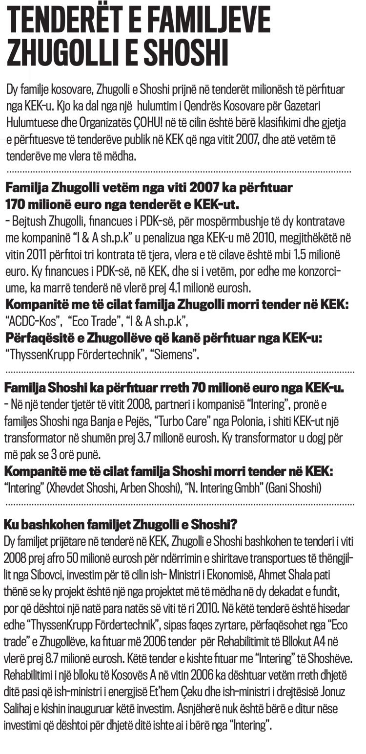 Familja Zhugolli ka përfituar nga KEK-u, vetëm nga viti 2007, rreth 170 milionë euro nga tenderët e mëdhenj, shumë kjo e marrë së bashku me gjithë konzorciume, kompani të regjistruara në Kosovë e me përfaqësitë e saj ndërkombëtare. Përderisa familja Shoshi, nga Banja e Pejës që me krejt kompanitë e saj, me tenderë të fituar me kompani të veçanta e me konzorciume, ka marrë hise në tenderë të KEK-ut në vlerë afro 70 milionë euro.