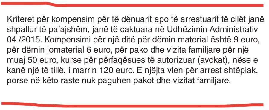 Kriteret për kompensim për të dënuarit apo të arrestuarit të cilët janë shpallur të pafajshëm, janë të caktuara në Udhëzimin Administrativ 04 /2015. Kompensimi për një ditë për dëmin material është 9 euro, për dëmin jomaterial 6 euro, për pako dhe vizita familjare për një muaj 50 euro, kurse për përfaqësues të autorizuar (avokat), nëse e kanë një të tillë, i marrin 120 euro. E njëjta vlen për arrest shtëpiak, porse në këto raste nuk paguhen pakot dhe vizitat familjare.