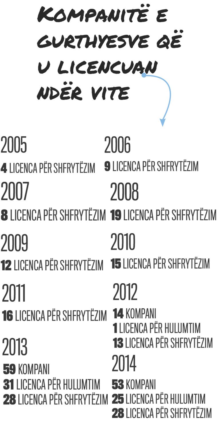Në listën e kompanive të licencuara për hulumtim dhe shfrytëzim, e cila është publike në uebfaqen e KPMM-së, shihet se pas vitit 2010 u shtua interesimi i kompanive që kanë aplikuar për hulumtim dhe shfrytëzim të gurit të fortë.