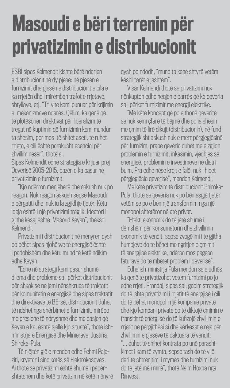 “Ai në fakt e menaxhon KEK-un edhe pse ka ardhur si këshilltar për ta rregulluar situatën në distribucion. Pra ky ka ardhë si ekspert për ta rregulluar situatën në distribucion dhe tash po shihen rezultatet e tij. Është e treta qeveri që Masoudi është pjesë e menaxhimit në mënyrë direkte apo indirekte”, thotë Shiroka-Pula.