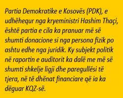 Partia Demokratike e Kosovës e ka kryer deri tani këtë detyrim ndaj KQZ-së dhe në katër raste ku nuk janë gjetur donatorët, mjetet nga fondi i ndarë nga Kuvendi për këtë subjekt janë derdhur në Buxhetin e Kosovës.