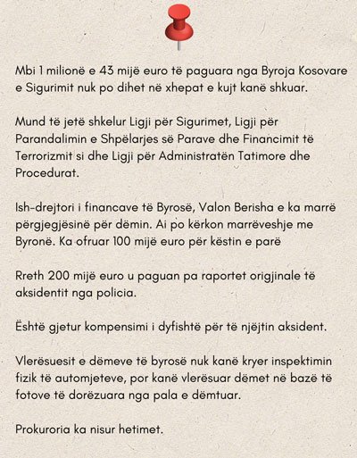 Për më tepër përmes avokatit Fanol Krasniqi më 10 mars 2025 ai i ka dërguar një letër Byrosë duke i propozuar marrëveshje lidhur me dëmin e shkaktuar. Rasti ka të bëjë me 1 milionëshin që nuk po i gjenden fija.