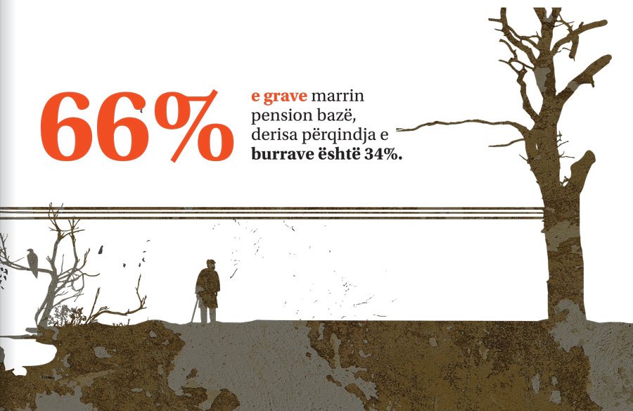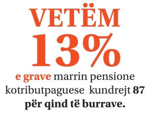 Kur është fjala te pensionet, vetëm 13 për qind e grave marrin pensione kotributpaguese kundrejt 87 për qind të burrave. Te pensionet bazike të moshës gjendja qëndron ndryshe: 66 për qind e grave marrin pension bazë, derisa përqindja e burrave është 34.