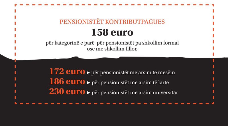 Këtu përfshihen vetëm pensionet e pensionistëve kontributpagues, numri i të cilëve sillet mbi 43 mijë vetë. Numri më i madh i pensioneve shkon për pensionistët e moshës, të cilët për muaj paguhen 75 euro.