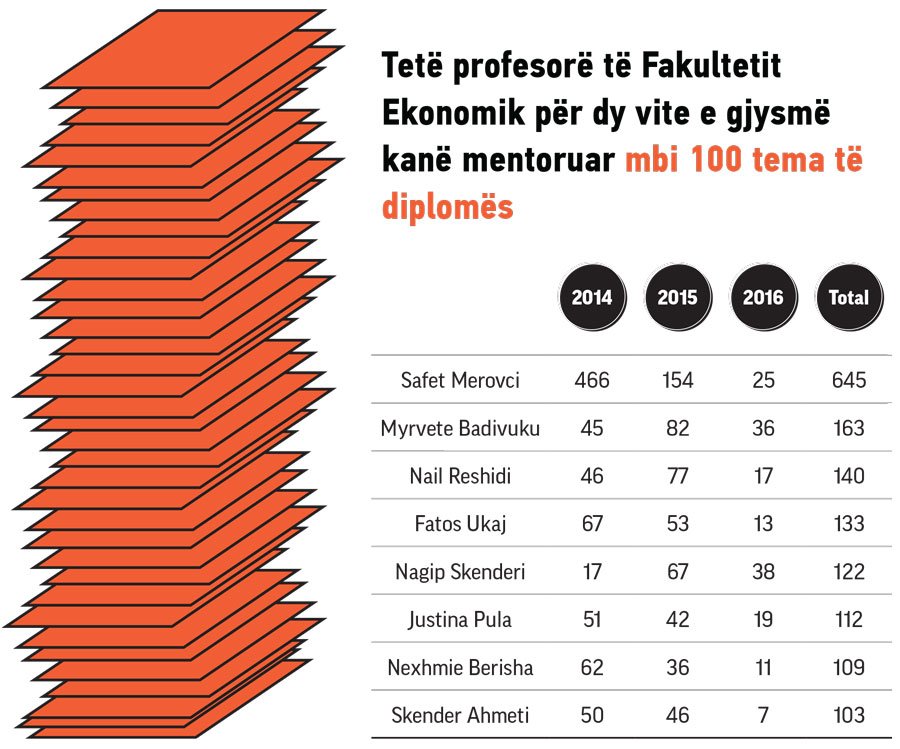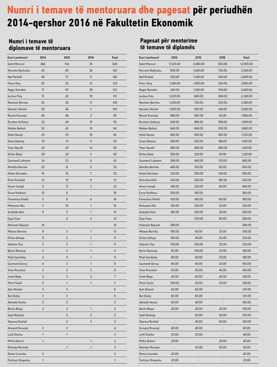 Gjatë këtyre dy vite e gjysmë në Fakultetin Ekonomik në nivelin Bachelor kanë diplomuar dy mijë e 429 studentë. Në një llogaritje që ka bërë Preportr duke krahasuar numrin e temave me pagesën 20 euro për mentorimin e një teme në bachelor është gjetur se profesorët që kanë mentoruar kanë marrë pagë shtesë mbi 48 mijë euro për dy vite e gjysmë.