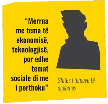 “Një temë për nivelin bachelor për sociologji e kam gati. Po du me qenë gjithçka në rregull, që me qenë edhe ti e kënaqur edhe profesori. Nuk ka ndodh që ndonjë profesor me ma refuzu ndonjë temë, por ka pasur raste kur kanë kërkuar të ndryshohet ndonjë kapitull”, thotë ai përmes telefonit.