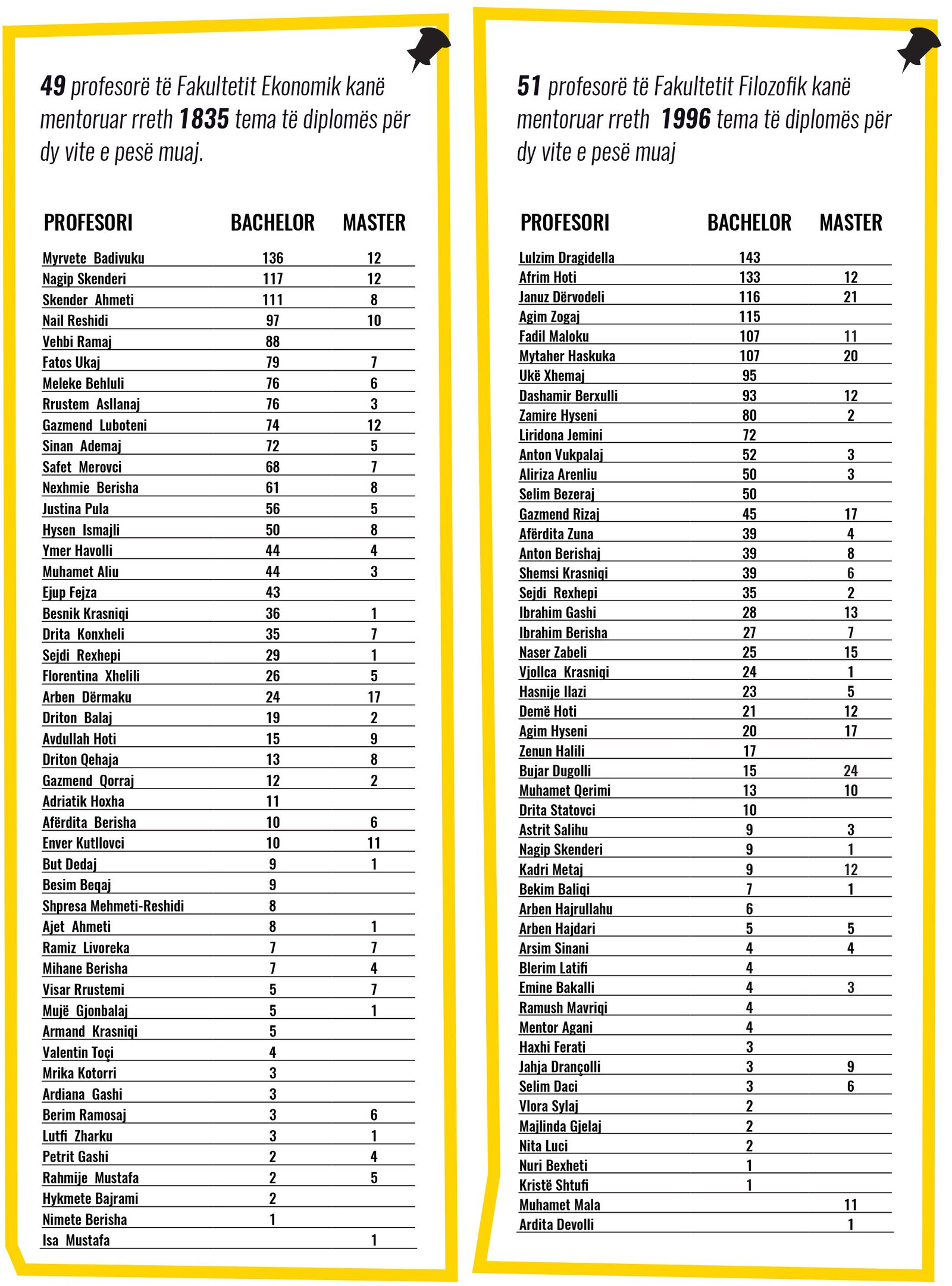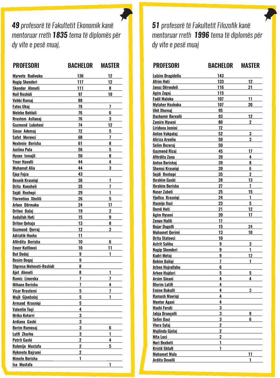Sipas të dhënave zyrtare nga Rektorati i UP-së, 49 profesorë të Fakultetit Ekonomik kanë mentoruar rreth 1835 tema të diplomës për dy vite e pesë muaj.