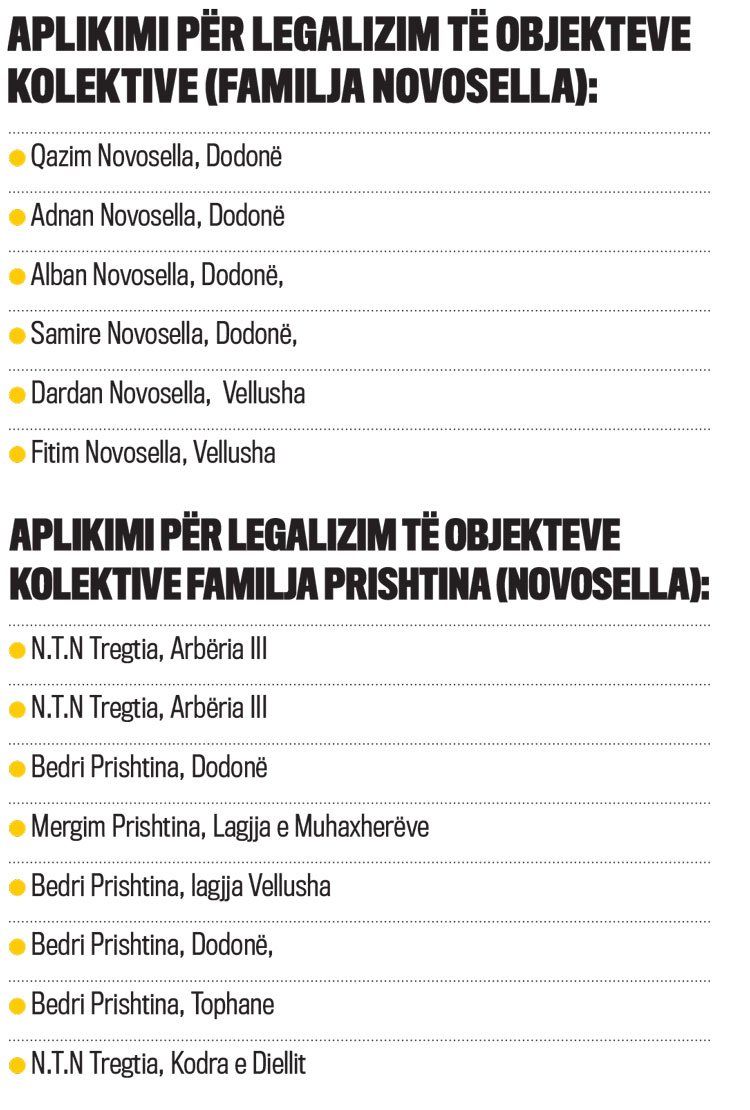 Familja Novosella ka në pronësi disa biznese ndërtimore dhe që nga paslufta ka bërë shumë ndërtime kolektive, shumë prej tyre pa leje paraprake, por që më vonë ka bërë kërkesë për legalizimin e tyre, duke aplikuar si individë e jo si kompani. Novosellët kanë bërë gjithsej gjashtë kërkesa për legalizim të objekteve kolektive, objekte këto që i kanë ndërtuar përmes kompanive të tyre që i kanë në pronësi.