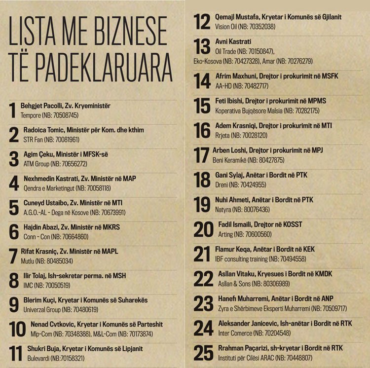 Edhe disa drejtorë të prokurimeve nuk i kanë deklaruar në AKK bizneset e tyre, të cilat janë në emër të tyre dhe janë të regjistruara në ARBK, ashtu siç janë të gjitha bizneset e këtyre 25 zyrtarëve.