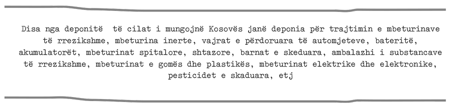 Në anën tjetër dëme të vazhdueshme mjedisore po shkaktojnë deponitë ilegale të mbeturinave. Ky është një problem i cili e ka shoqëruar Kosovën ndër vite dhe siç duket largimi i këtyre deponive vazhdon të jetë sfidë për institucionet përkatëse shtetërore.