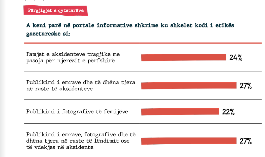Qytetarët janë pyetur nëse kanë parë shkelje të etikës së gazetarisë duke u nisur nga perspektiva e tyre se si e kuptojnë këtë gjë. Sipas përgjigjeve, rezulton se 22 përqind kanë parë raportime të publikimit të fotografive të fëmijëve në portale, duke i portretizuar varësisht nga ngjarjet që kanë ndodhur. 24 përqind thonë se kanë parë publikime të emrave dhe të dhëna tjera në raste të aksidenteve tragjike.