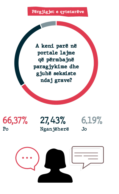 Në pyetjen se a keni parë në portale lajme që përmbajnë paragjykime dhe gjuhë seksiste ndaj grave, 66 përqind janë përgjigjur po, mbi 27 përqind janë shprehur se nganjëherë dhe 6 përqind janë shprehur jo.
