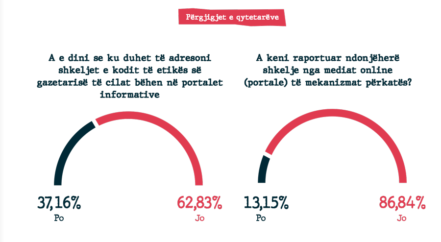 Anketimi nxori një të dhënë shqetësuese për faktin se 62 përqind të respondentëve nuk dinë se ku duhet t’i adresojnë rastet e shkeljeve që konsiderojnë se janë bërë nga portalet informative. Ndërkaq 37 për qind u shprehen se dinë ku t’i adresojnë, por disa nga ta mendonin se duhet t’i raportojnë në polici dhe prokurori. Mbi 86 përqind kanë thënë se nuk kanë raportuar ndonjëherë ndonjë lajm te ndonjë mekanizëm përkatës, ndërkaq 13 përqind thonë se i kanë raportuar ato lajme në KMShK. Prej tyre, 40 përqind thonë se KMShK ua ka miratuar ankesën.