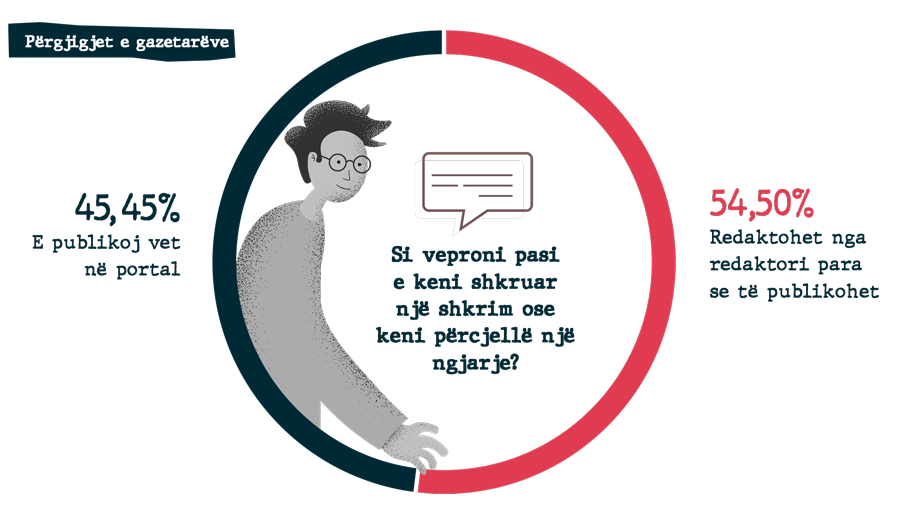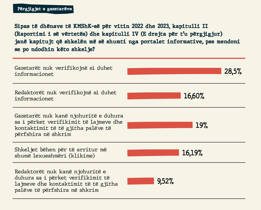 Në pyetjen pse më së shumti shkelen kapitujt e kodit të etikës që kanë të bëjnë me raportimin e së vërtetës dhe të drejtën për t’u përgjigjur, 28 përqind janë përgjigjur se kjo ndodh për shkak se gazetarët nuk verifikojnë sa duhet informacionet, 16 përqind janë përgjigjur se redaktorët nuk verifikojnë sa duhet informacionet, ndërkaq rreth 17 përqind thonë se këto lajme publikohen për të përfituar klikime.
