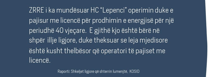 Shkelja e parë që është bërë është se atyre u është dhënë leje ujore, në vend se të përdorej procedura e koncesionit, sipas ligjit, pra procedura e konkursit publik ku edhe buxheti i Kosovës do të gjeneronte të hyra