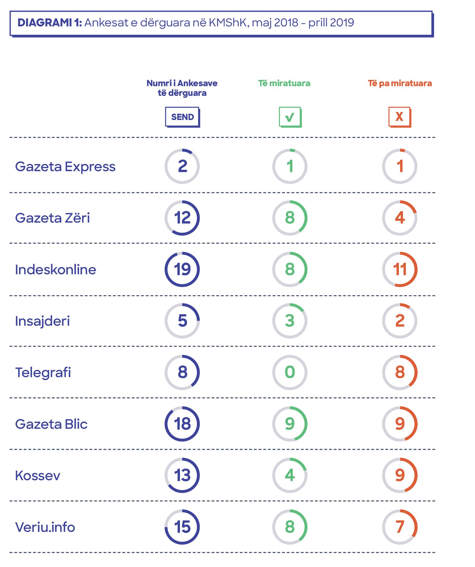Në bazë të të dhënave që janë nxjerrë nga monitorimi i shkrimeve për periudhën maj 2018 deri në prill të vitit 2019, rezulton se në KMShK janë dërguar 92 shkrime, përkatësisht ankesa. Këto shkrime janë dërguar duke ngritur dyshime se mediat të cilët i kanë publikuar ato, kanë bërë shkelje të Kodit të Mediave të Shkruara të Kosovës. Nga totali prej 92 ankesave janë miratuar 41 prej tyre.