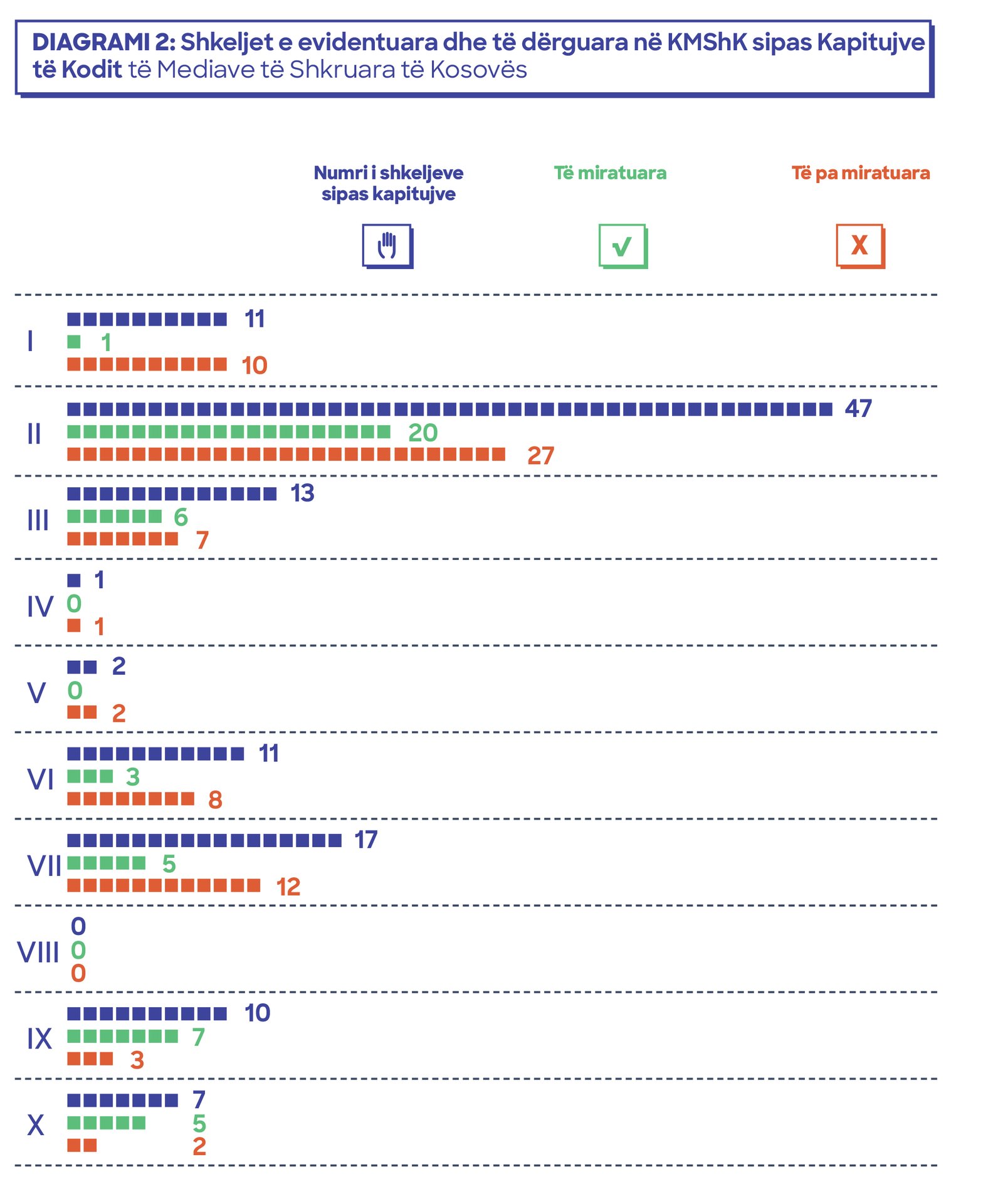 Rezultatet e monitorimit tregojnë se më së shumti shkrime, gjithsej 47, që janë evidentuar dhe pastaj janë dërguar në KMShK, kanë të bëjnë me Kapitullin II të Kodit të Mediave të Shkruara të Kosovës. KMShK-ja ka miratuar 19 prej tyre.
