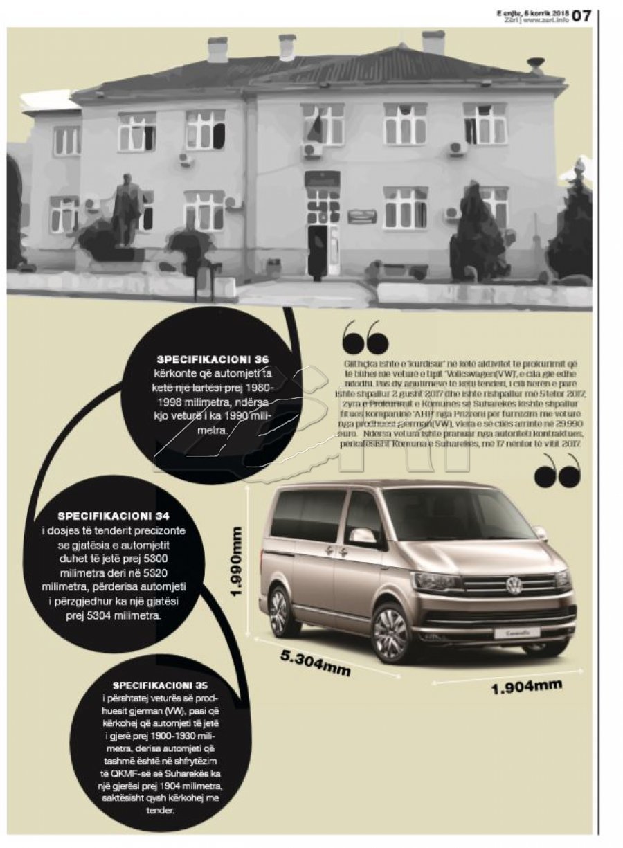 Edhe specifikacioni 35 i përshtatej veturës së prodhuesit gjerman (VW), pasi kërkohej që automjeti të jetë i gjerë prej 1900-1930 milimetra, derisa automjeti që tashmë është në shfrytëzim të QKMF-së së Suharekës ka një gjerësi prej 1904 milimetrash, saktësisht qysh kërkohej me tender.