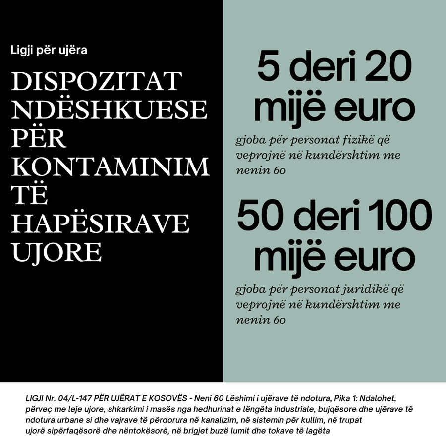 Vite më parë, Kosova ka miratuar Ligjin për Ujëra i cili parasheh dispozita ndëshkuese për persona fizikë dhe persona juridikë të cilët kontaminojnë hapësirat ujore. Në nenin 60 të këtij ligji ndalohet përveç me leje ujore shkarkimi i masës nga hedhurinat e lëngëta industriale, bujqësore dhe ujërave të ndotura urbane si dhe vajrave të përdorura në kanalizim, në sistemin për kullim, në trupat ujorë sipërfaqësorë dhe nëntokësorë, në brigjet buzë lumit dhe tokave të lagëta. Nëse shkelet kjo dispozitë ligjore po me të njëjtin ligj parashihen gjobat në vlera shumë të larta deri në 100 mijë euro.