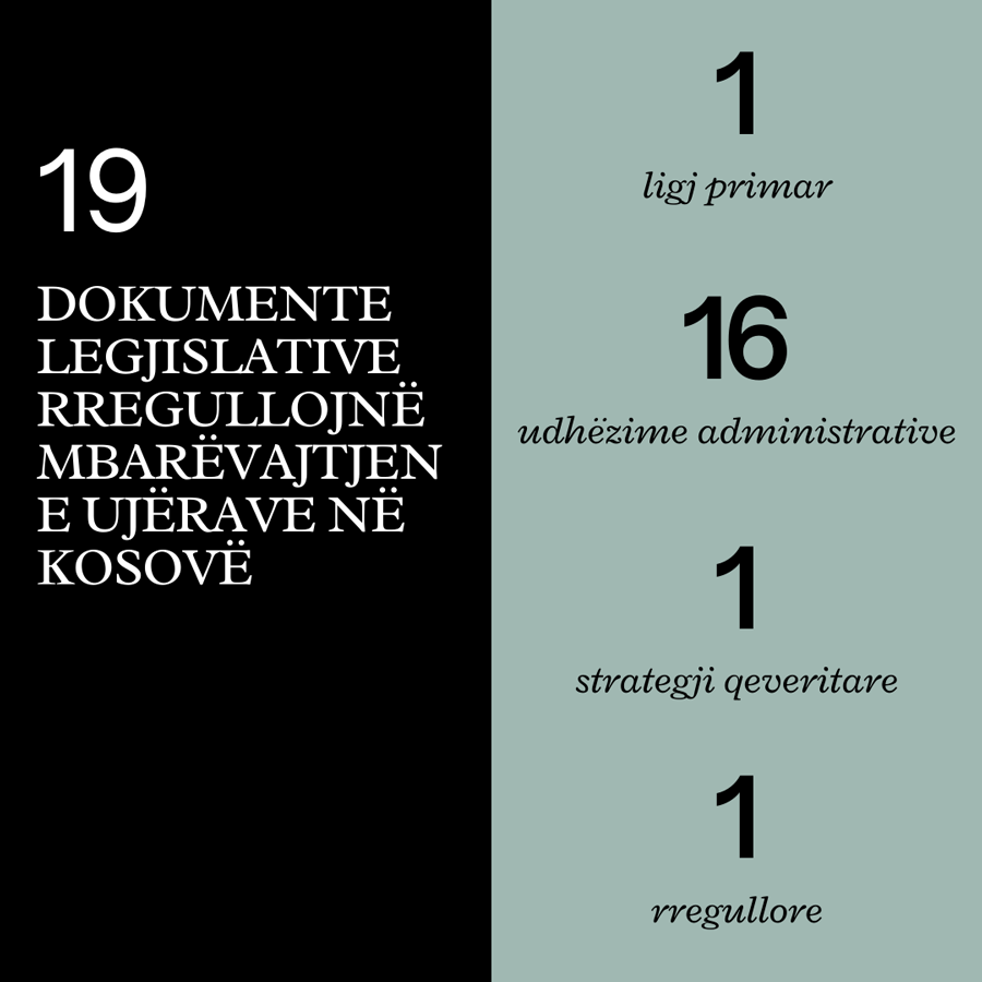 Edhe pse në Republikën e Kosovës janë miratuar 19 dokumente legjislative që rregullojnë mbarëvajtjen e ujërave (një ligj primar, 16 udhëzime administrative, një rregullore dhe një strategji qeveritare), problemi kryesor duket të jetë zbatimi i tyre në praktikë nga institucionet e Kosovës. Në Ministrinë e Mjedisit dhe Planifikimit Hapësinor dhe Infrastrukturës janë njëzet të punësuar për inspektim të ujërave.
